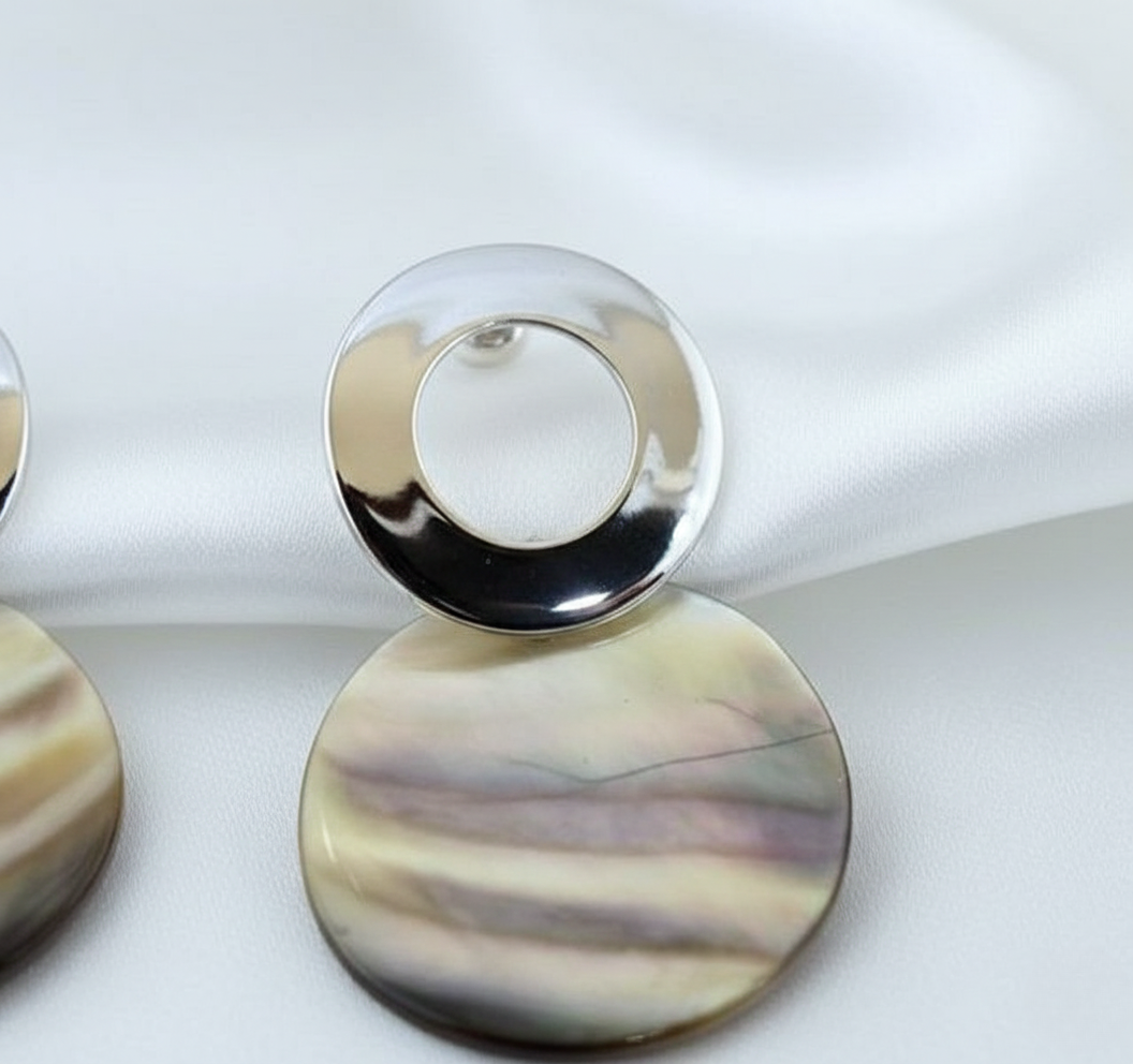Elevate your style with these elegant silver-tone circular drop earrings featuring a stunning mother-of-pearl finish. Designed with a glossy metal top and a natural shell-textured disc, these earrings offer a perfect balance of modern and classic charm. Lightweight and comfortable, they are ideal for all-day wear. Perfect for parties, office wear, and casual outings. A versatile accessory that adds effortless sophistication to any outfit.